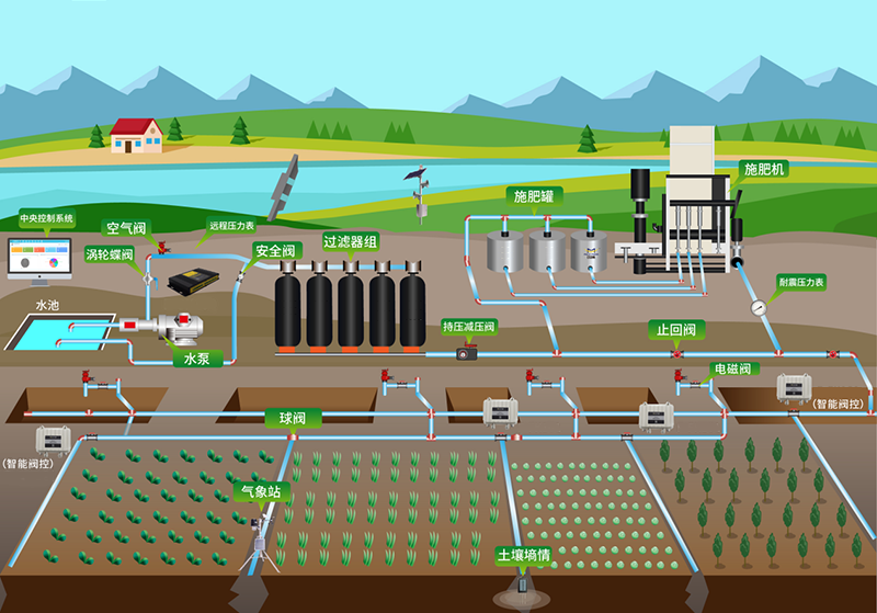 智慧灌溉系统根据作物的需求规律。土壤水分、土壤性质等条件提供最合适的水肥灌溉方案,水肥一体化系统安装该方案进行定时定量灌溉。